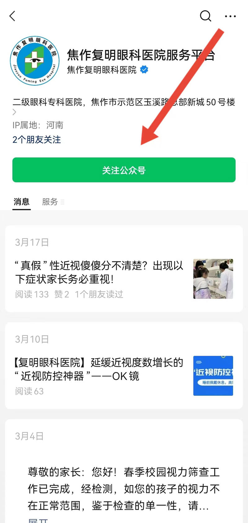 步驟一:關注“焦作復明眼科醫(yī)院服務平臺”